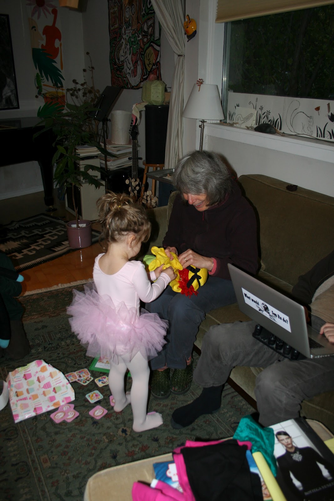 Izzy chose a silk crown as his present to Hannah, Eli chose a stuffed, knit panda, I had found a doll for her back in Woodstock that I had managed to keep secret. While we were out buying party supplies Aunt Bonnie and Uncle Eric found Hannah a beautiful ballet outfit that once put on her she refused to be without even into the following day.